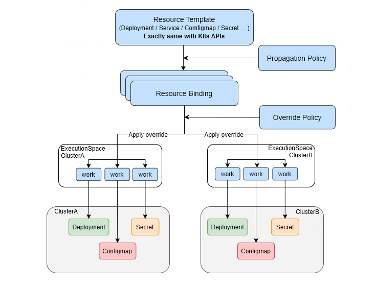 Overrides:对 template 中的字段进行覆盖重写,用于对资源的配置更新。如示例中对名称为 cluster-1 的 member cluster 中 deployment 的副本数和镜像进行了重新配置。Override 中未选择的集群使用 template 的定义,保持不变。