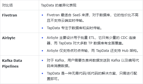 以下是 TapData 与其他一些热门数据集成工具选项的对比: