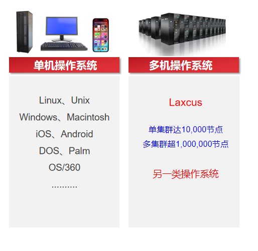单机操作系统,如我们所熟知,其设计初衷是为了满足单台计算机的运行需求,其本质是基于单机环境的串行计算,经过了数十年的发展,不论是技术和产品已经非常成熟。然而随着人工智能的出现,计算量的爆炸式增长,计算需求的日益复杂化,单机操作系统在处理这些大算力业务,已经显露出其局限性,变得力不从心。其具体表现为计算工作被限制在一台硬件设备内,无法充分利用多设备的协同优势。若要实现更大规模的计算处理工作,必须在操作系统之上的应用层搭建分布式和并行计算模块,才能实现大规模计算业务的延展,这些工作目前已经在云计算平台和超级计算机上得以实施。但是这种裱糊匠的做法,并没有从根本上解决大规模计算和算力输出的问题,而且造成了系统整体结构复杂,稳定性和可靠性不足,以及应用软件的设计开发困难,缺乏统一标准,对用户不友好、成本高的问题。