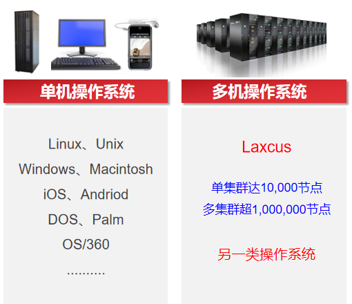 也就是说,传统操作系统只对应一台实体计算机,而Laxcus分布式操作系统无论后端聚合了有多少台计算机,在前端的表现就像是一台计算机一样。这是Laxcus分布式操作系统和传统操作系统的根本区别。