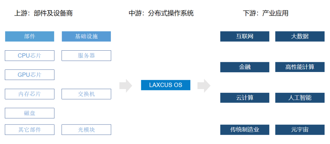 Laxcus做为一个双模态系统,单机模式兼容Linux,多机模式面向大规模算力业务。Laxcus做为整个计算体系的中间层,对下管理着海量的CPU、GPU和其它各种硬件计算单元,对上为各种应用软件提供分布式的运行环境。Laxcus主要的应用场景有:人工智能、大数据、高性能计算、虚拟现实、区块链等,同时也是云计算、互联网、物联网、超级计算机、产业互联网的基础平台。目前Laxcus已经在很多应用场景中部署使用。