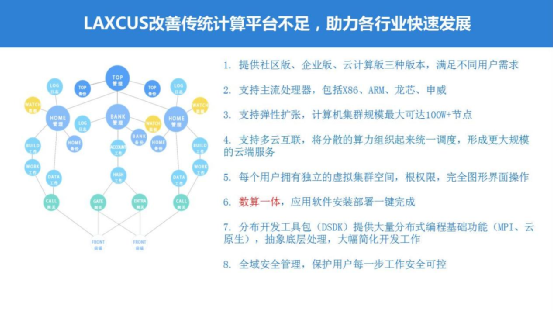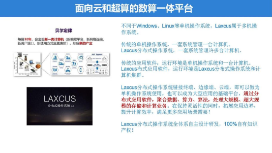 经过多年的持续研发演进,Laxcus已经是一个高扩展、容错、多人共享、多机协同分布运行的系统软件,现在正在致力打造成新一代的数算一体平台。它基于云端环境和计算机集群,集成大数据、系统安全、集群虚拟化、容器、集群智能管理模型,支持云端、边缘端、终端分布协同,面向大型应用业务,融合云原生,通过支持分布式应用软件,聚合数据、算力、算法,处理大规模、超大规模的分布式存储和分布式计算工作。为以工业4.0为代表的ICT智能产业,提供一站式的信息基础底座。