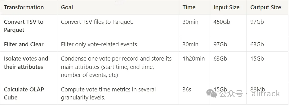 由于每次投票都由多行数据组成,我们需要将所有信息压缩到一条记录中,以便于计算。这一步的操作比较复杂,因为查询变得更加复杂,而且 DuckDB 无法一次性处理所有数据。
