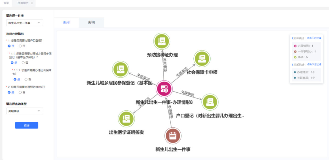 利用TopGraph知识构建系统将企业及个人的“一件事”办理事项进行系统化梳理,整合办理事项、输入材料、输出材料、涉及的部门、办理时长等数据,实现一站式服务。无论是企业信息变更、开办运输企业、餐饮店开办,还是新生儿出生、教育入学、残疾人服务、退休等事务,TopGraph都能构建出清晰的事项知识图谱。这不仅为办事人员提供了一目了然的办事指南,更通过避免资料重复提交和跨部门协调审批,极大简化了办理流程。