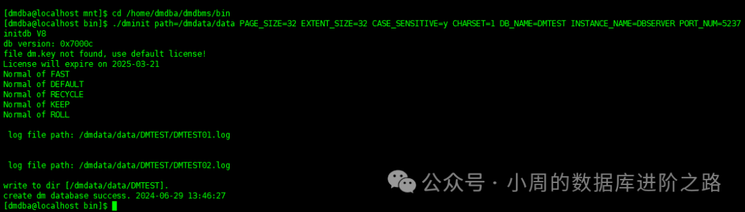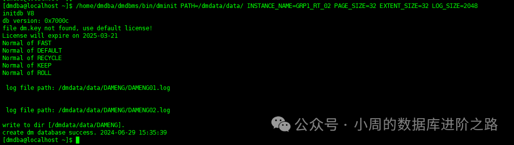[dmdba@localhost bin]$ ./dminit path=/dmdata/data PAGE_SIZE=32 EXTENT_SIZE=32 CASE_SENSITIVE=y CHARSET=1 DB_NAME=DMTEST INSTANCE_NAME=DBSERVER PORT_NUM=5237