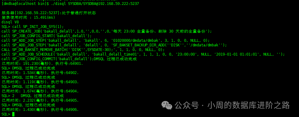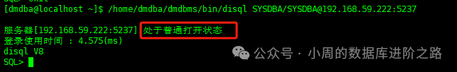 [dmdba@localhost bin]$ ./disql SYSDBA/SYSDBA@192.168.59.222:5237