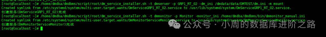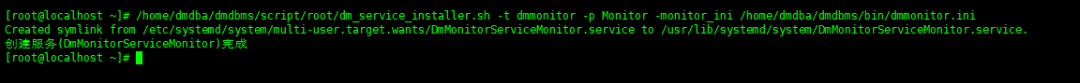 [root@localhost ~]# /home/dmdba/dmdbms/script/root/dm_service_installer.sh -t dmmonitor -p Monitor -monitor_ini /home/dmdba/dmdbms/bin/dmmonitor.ini