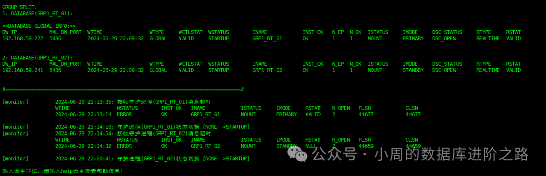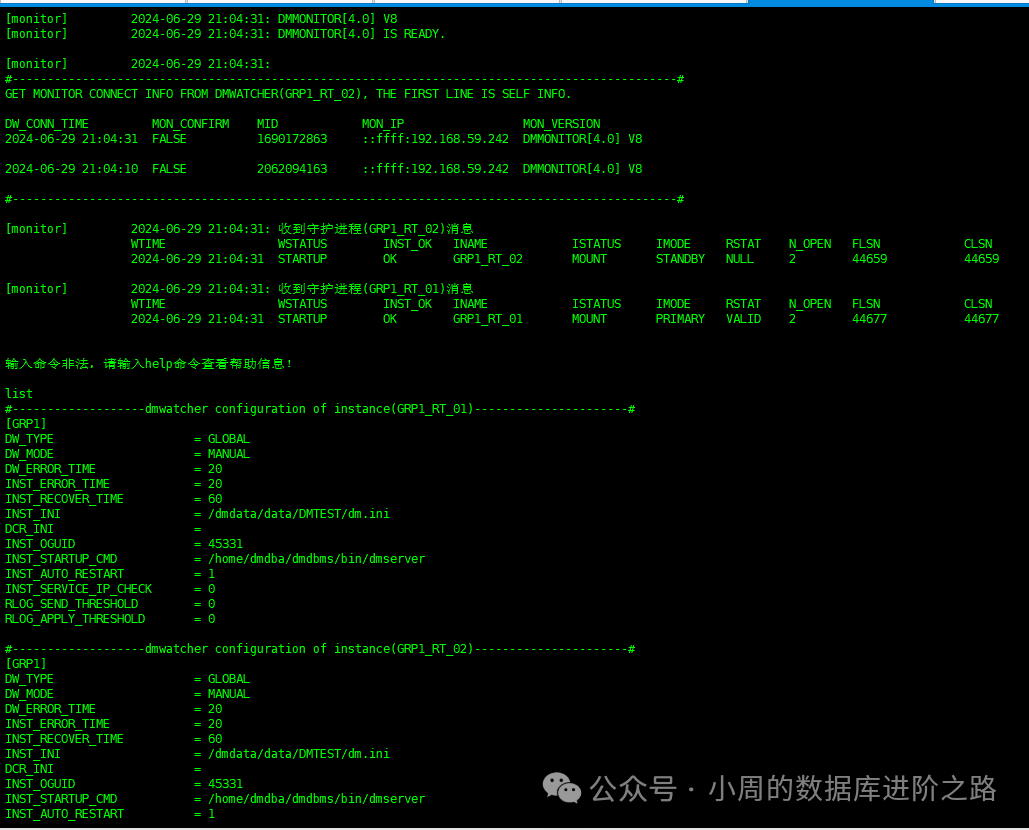 [dmdba@localhost bin]$ ./dmwatcher /dmdata/data/DMTEST/dmwatcher.ini
