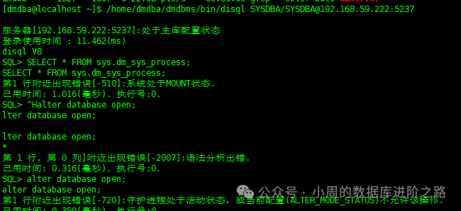 注意:这里有个问题,之前的数据库一直是mount状态。需要先停止守护进程,修改几个参数,启动数据库至open状态。