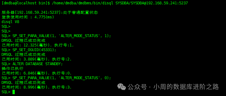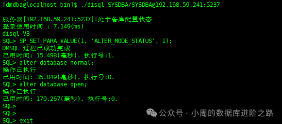 [dmdba@~]$ /home/dmdba/dmdbms/bin/disql SYSDBA/SYSDBA@192.168.59.241:5237