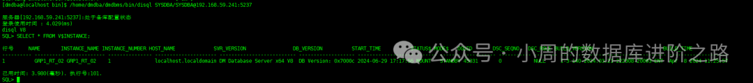 [dmdba@localhost bin]$ ./disql SYSDBA/SYSDBA@192.168.59.241:5237