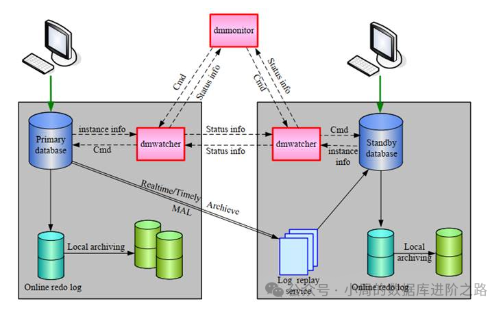 DM 数据守护包含多个数据库,主库和备库部署在不同的机器上,数据分别保存在各自的存储上,主库传递 Redo 日志到备库,备库重演 Redo 日志实现数据同步。