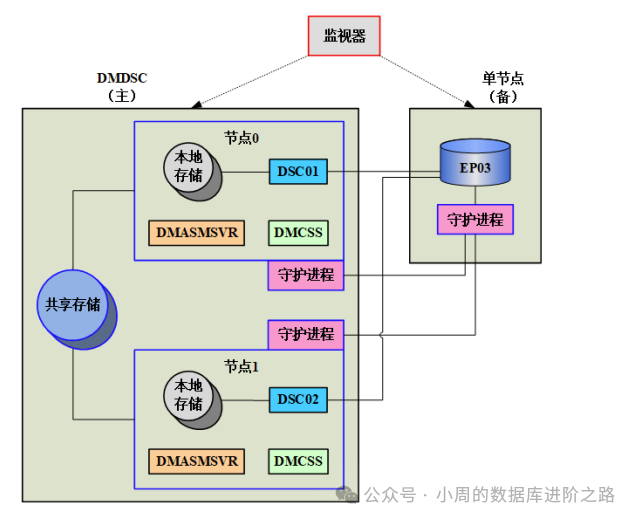 DMDSC 主备支持集群和单节点之间互为主备库,一般建议将 DMDSC 集群作为主库,单节点作为备库: