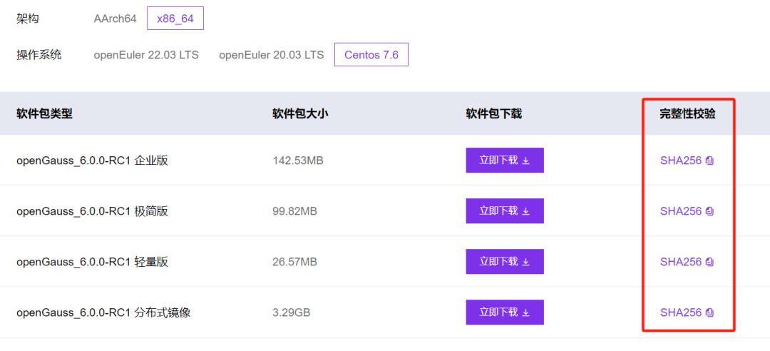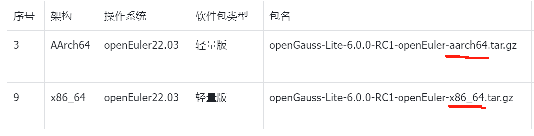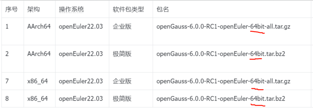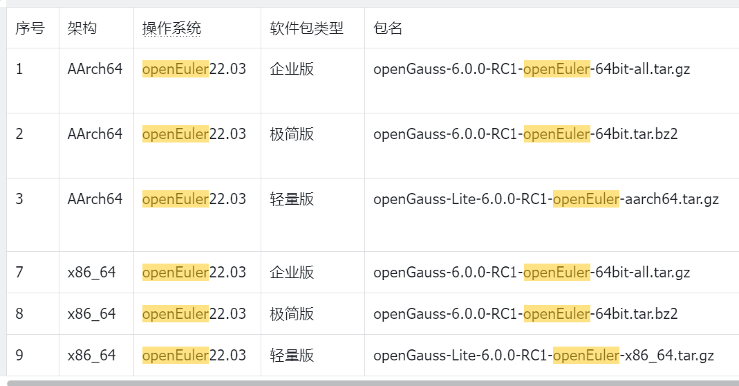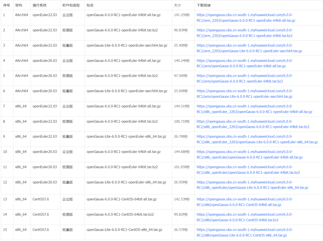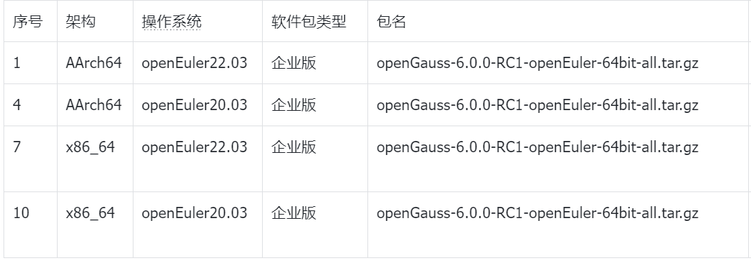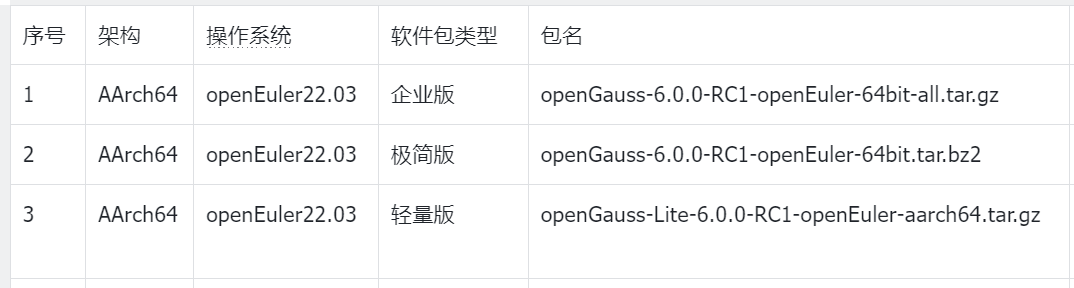 企业版:openGauss-All-6.0.0-RC1-openEuler-64bit.tar.gz 极简版:openGauss-Core-6.0.0-RC1-openEuler-64bit.tar.gz 轻量版:openGauss-Lite-6.0.0-RC1-openEuler-64bit.tar.gz