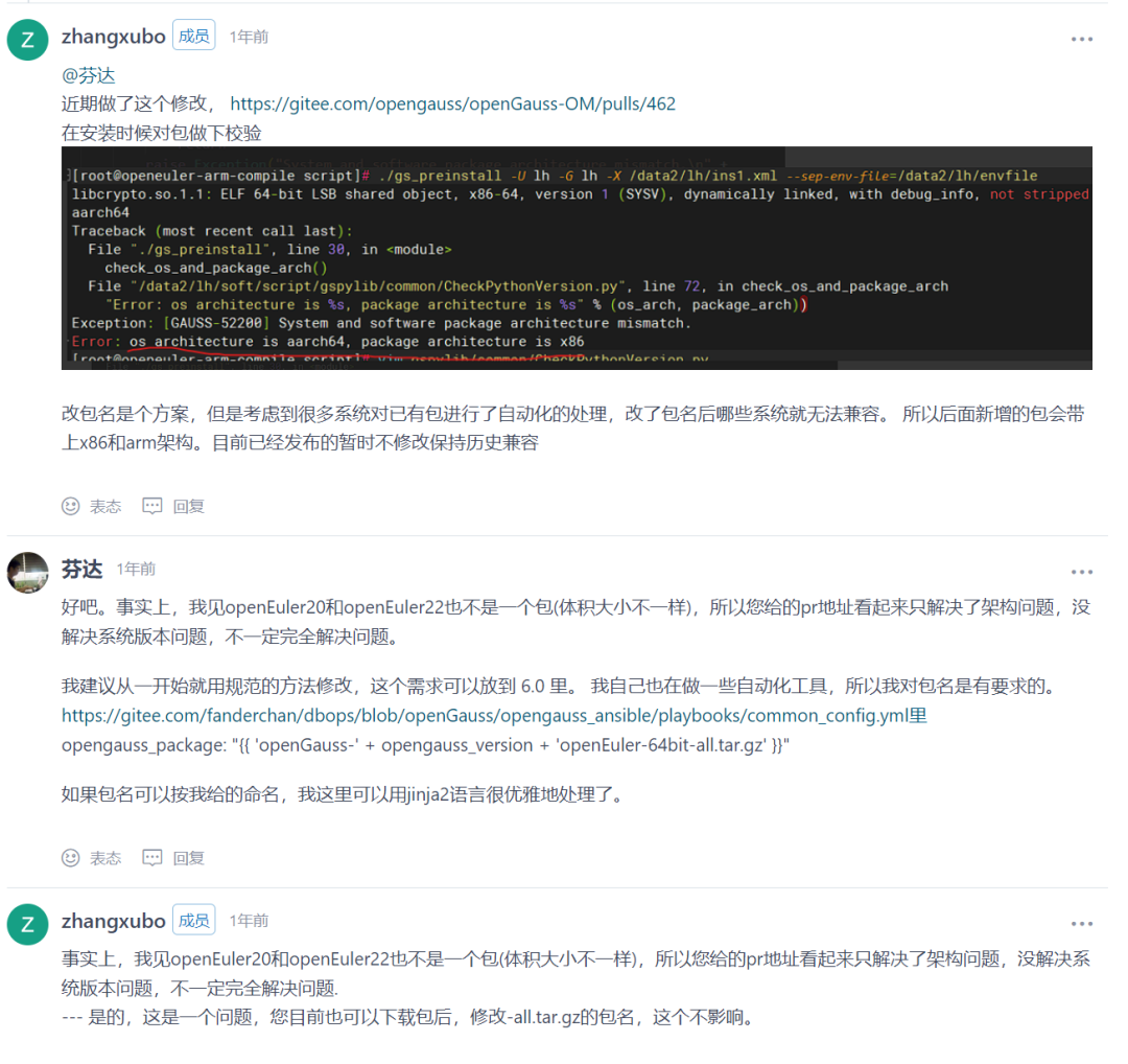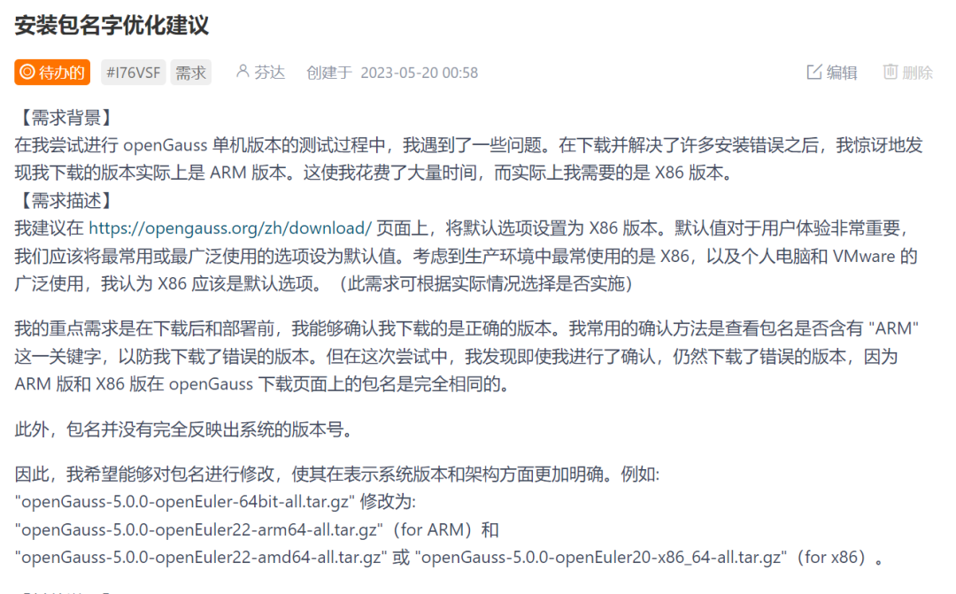 我的 dbops1.0 版本开始支持离线部署 openGauss 5.0.0 的企业版单机架构。如果服务器可以连接互联网,由 dbops 支持在线部署,自动下载安装包和部署,一般无问题。但 dbops 也支持离线部署,用户如果自行下载和上传 openGauss 安装包,那就可能出错了。所以我在一年前就给官方提过 issue,希望优化,如下图。