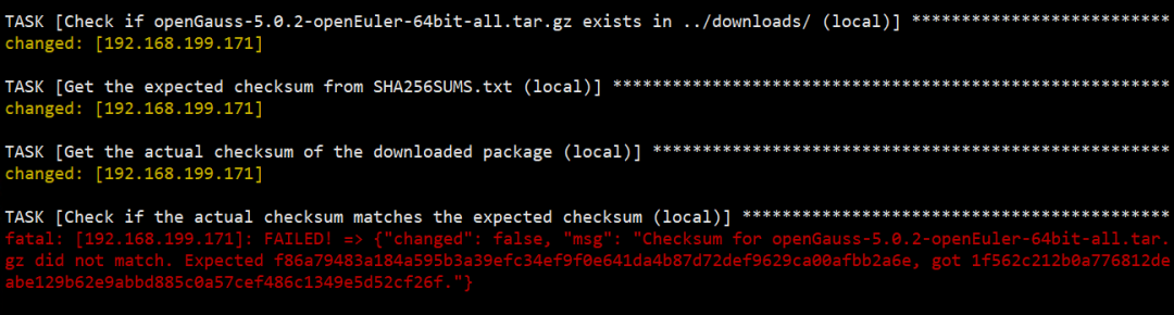 ),dbops1.3 将会通过 pre_task 步骤检查你下载的软件包,是否和你的操作系统和架构匹配,保证你使用正确的安装包来部署 openGauss。采用的方法是,通过内置维护一份官方软件包 checksum 列表来实现。