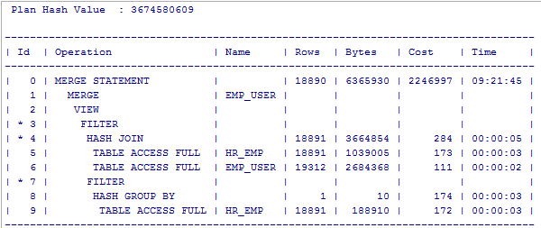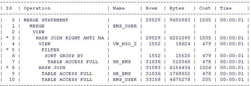 | 9 | TABLE ACCESS FULL | HR_EMP | 18891 | 1039005 | 173 | 00:00:03 |