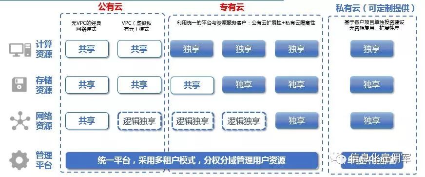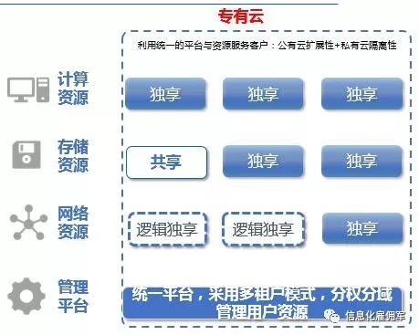 二、专有云(专属云)实际是上基本于公有云做了一部分的定制。但根据定制的深度不同,其实专有云有三种不同的定制深度。1.仅是计算资源独享 2、计算、存储独享 3、计算、存储、网络独享。大家知道服务商提供的专有云大部分是哪种吗?为降低成本、便于维护管理,其实90%以上提供的都仅为计算资源独,而其它的资源都与公有云共享。