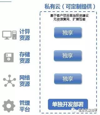 专有云的定位主要在于有一定的安全性要求、希望资源能够自己定制的客户,如在公有云上实现集团客户整体上云(其中有财务、ERP类应用)的客户。
