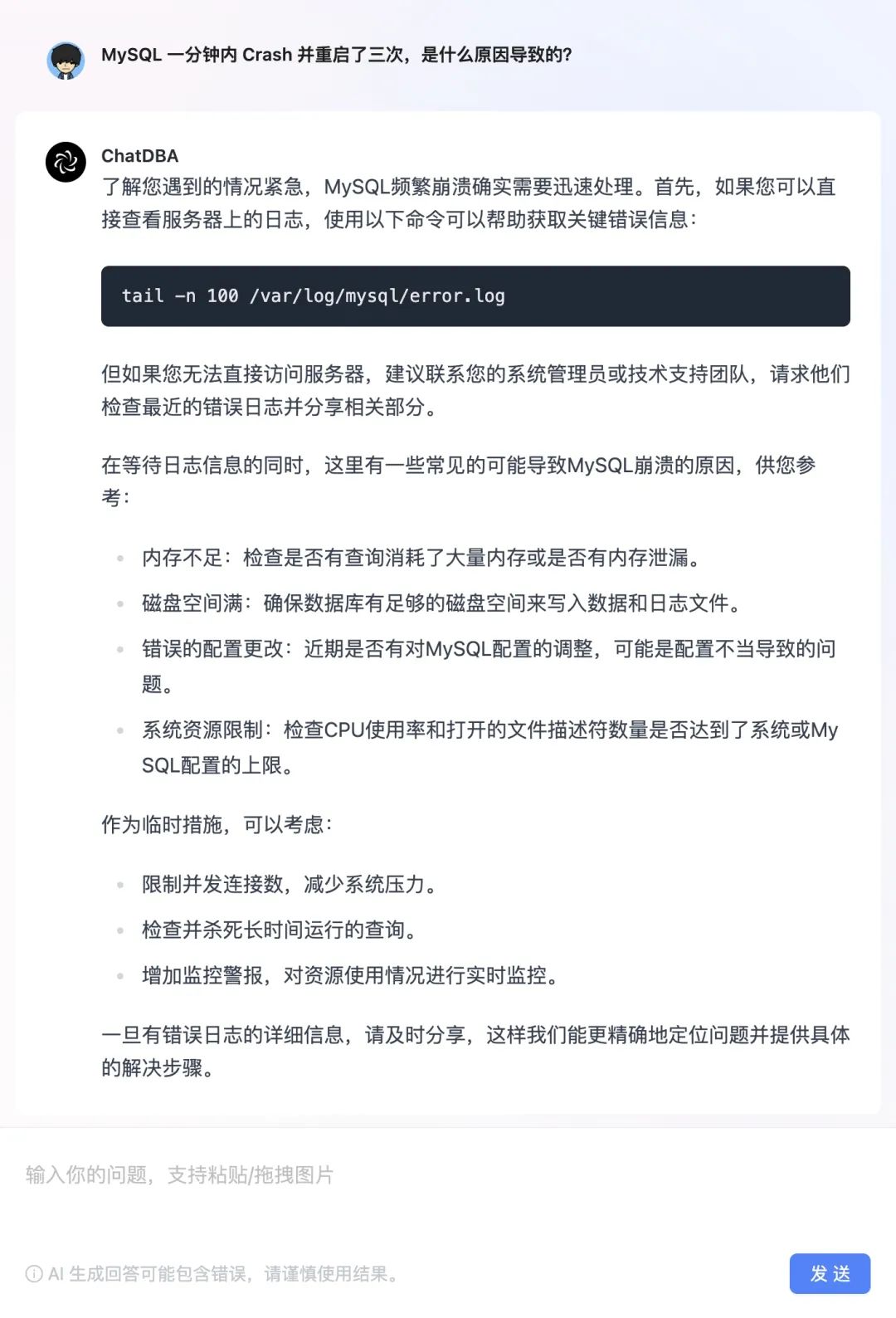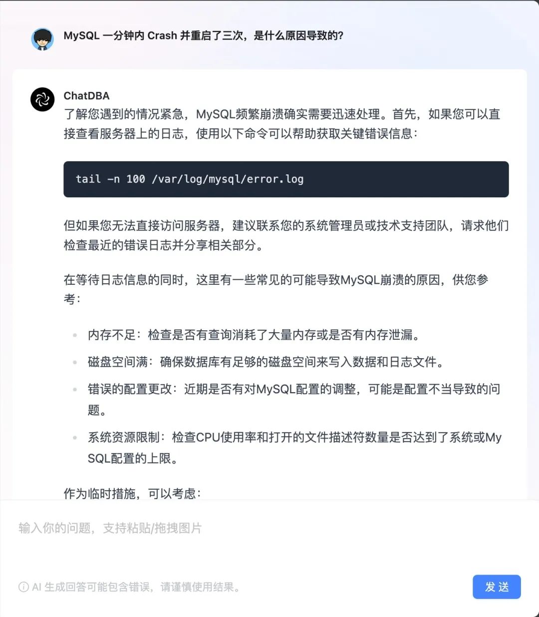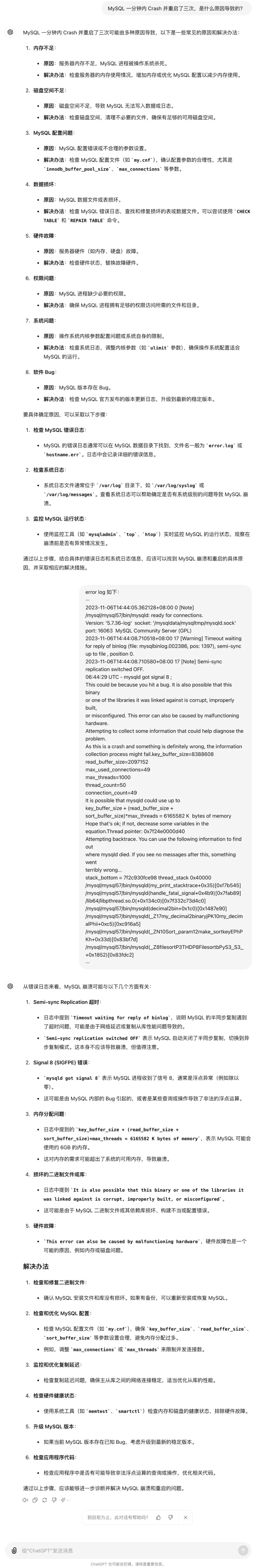 本期我们使用了一个之前遇到过的问题来问下 ChatDBA,他首先让我们去查询错误日志,同时猜测了一些可能导致这个问题的原因。
