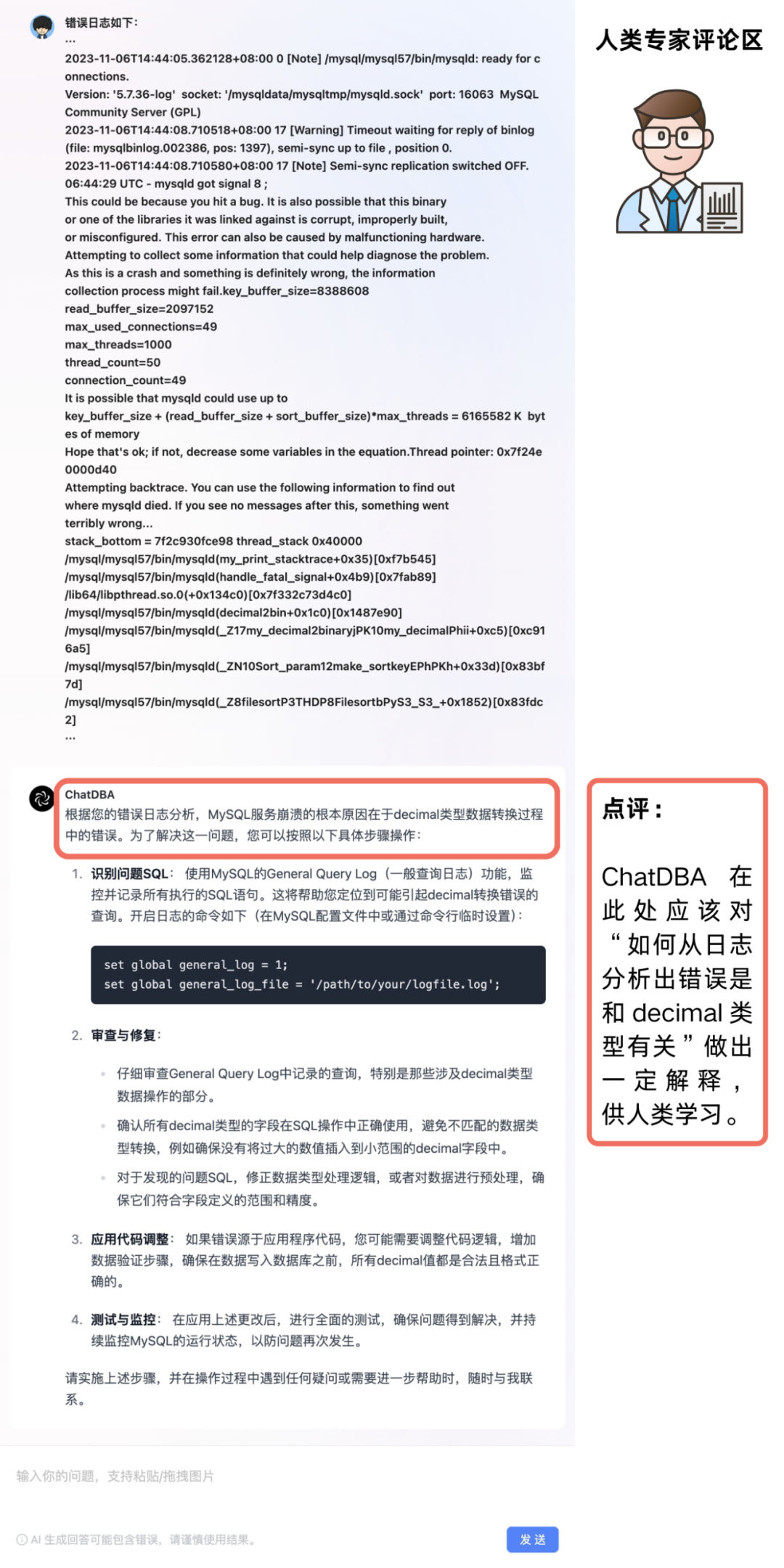紧接着我们就将错误日志直接发给了 ChatDBA,发现 ChatDBA 识别出日志中包含的类型,同时他也给出了临时的解决方案,接下来我们将 SQL 语句与对应的表结构输入给 ChatDBA。