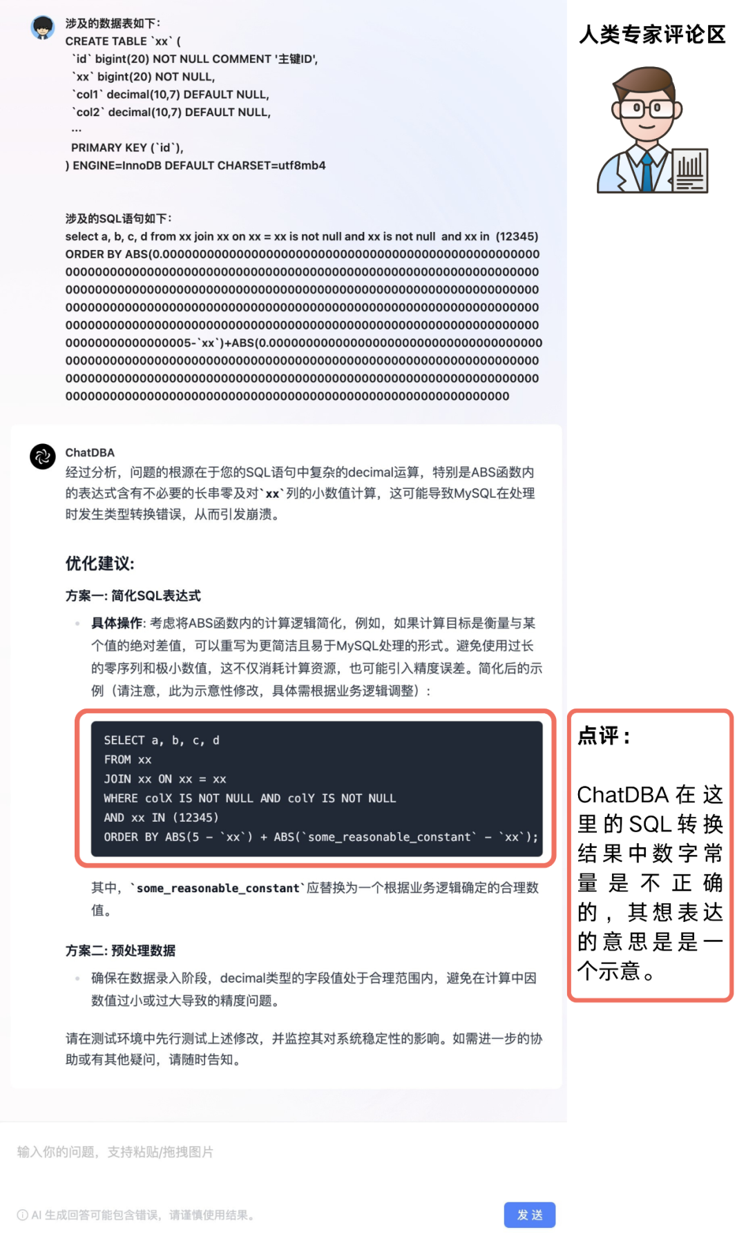 到这里 ChatDBA 基本上就判断了问题的根本原因是由于 decimal