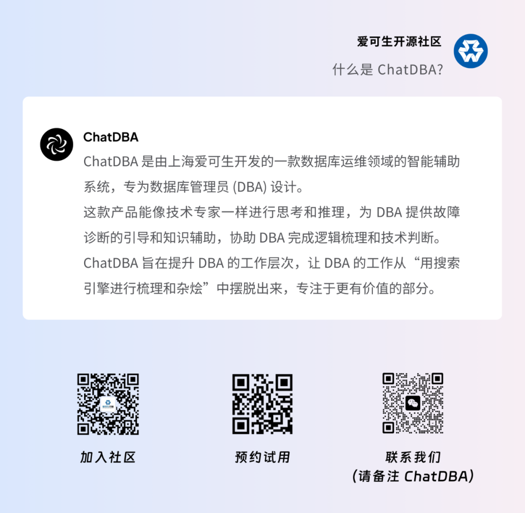 目前,ChatDBA 还在最后的准备阶段,会尽快跟大家见面。想预约试用的朋友,可以扫码文末的 预约试用 二维码或点击 原文链接。我们正在对 DBA 群体试用大模型的情况进行调研,这对我们打磨 ChatDBA 的使用体验非常重要。