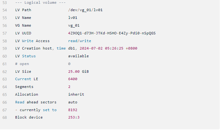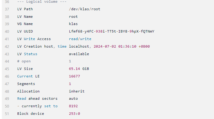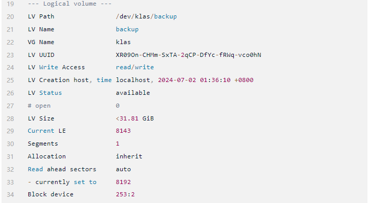 3. 逻辑卷(Logical Volume, LV):逻辑卷是从卷组中分配的虚拟分区,对用户和应用程序来说,逻辑卷就像是常规的硬盘分区。用户可以在逻辑卷上创建文件系统并挂载使用。逻辑卷的大小可以动态调整,而不受物理磁盘布局的限制。