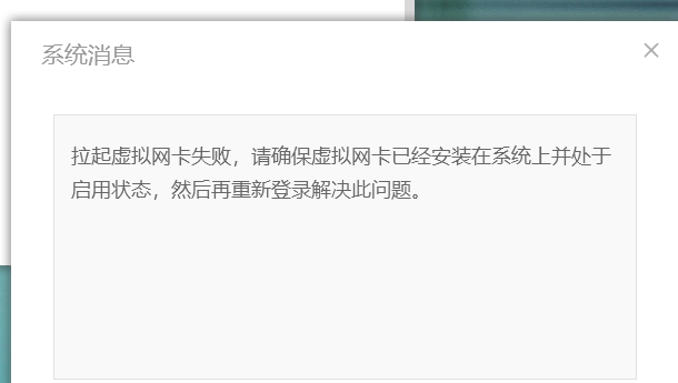 提示一:拉起虚拟网卡失败,请确保虚拟网卡已经安装在系统上并处于启用状态,然后再重新登录解决此问题。