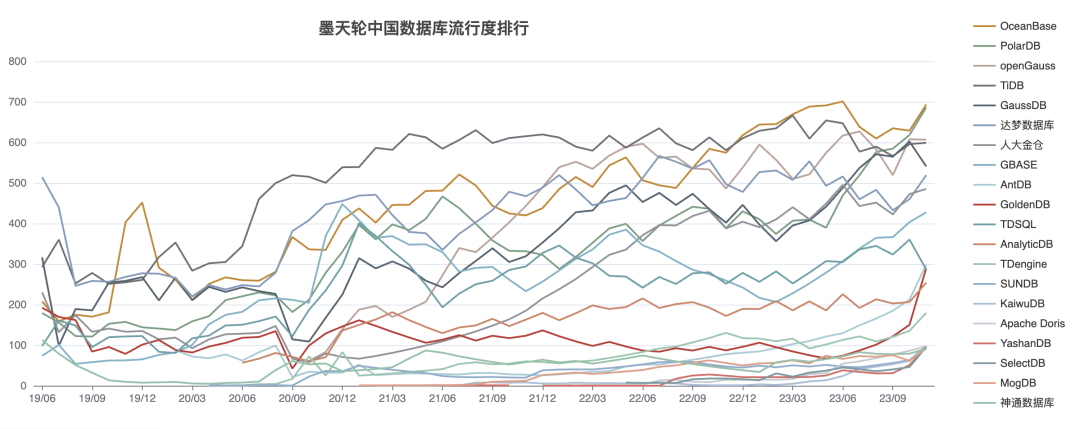 我列举一下墨天轮“中国数据库流行度”排行榜2023年11月的数据,这其中可以给出一个范例,目前国产数据库已经呈现出欣欣向荣的局面,在大量应用场景中实现了创新替代。