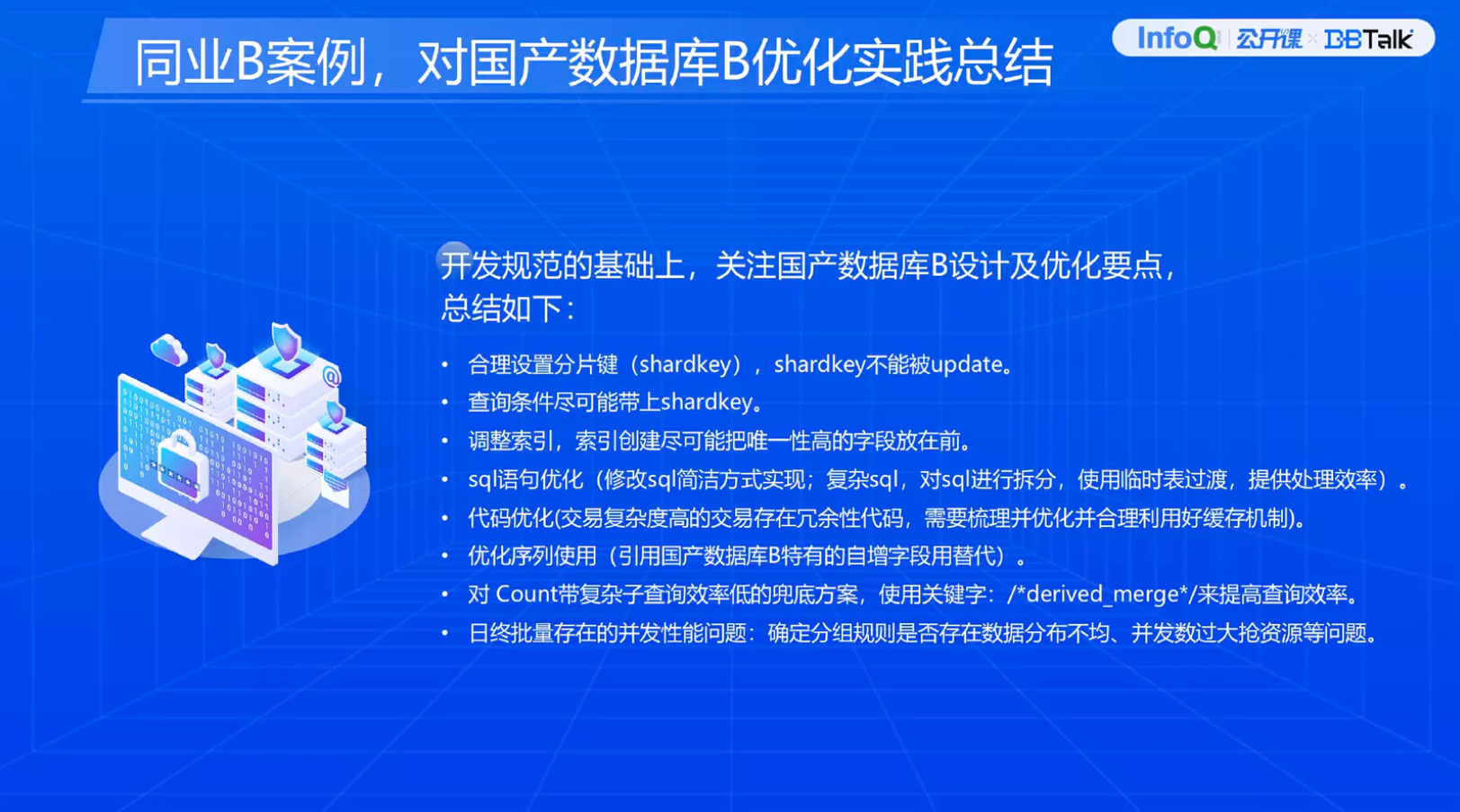 再总结看一下分布式数据库对接过程当中要做哪些事情。首先是分片键的配合,因为数据量很大,为了保证精准分配,Shardkey 一定要带上。在报表规范、交易接口、数据传递过程当中,这些东西要考虑到分片键怎么向下传递。另外就是原本的 SQL 优化特性在这里也是要注意的。以前索引创建的时候可能注意压索引就行了,但是现在不一定压到索引,同时要求高唯一性的数据字段向前放,这样可以更好地命中索引。