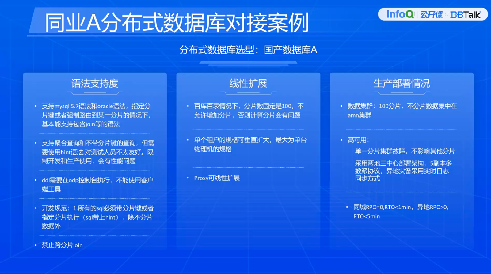 首先看第一个国产数据库对接的案例。该数据库的对接过程中,其语法支持度是比较不错的,能够原生支持 MySQL 5.7 语法以及 Oracle 语法。它的数据是通过分片的方式做多片存放,在多片存放的条件下我们需要聚合查询,它在语法层面给我们提供了聚合查询的能力,但是通过 Hint 来实现,对测试人员不是很友好。同时这也可能带来一些潜在的新问题,要求开发人员充分了解 Hint 机制以及 Hint 对语法的要求。所以在这一侧,我们对它的 Hint 使用做了一些限制,之后把聚合的结果、聚合的诉求上移到应用侧做处理。同时在数据库这一侧,还有一些其他的方式跟以往行为或者做法不太一样,比如说 DDL 语言。以前我们更习惯拉开一个客户端,做 SQL 执行,或者可以看到一个表的结构的方式。但是现在更多要求通过控制台来完成 DDL 的执行,需要大家有一定的适应过程。