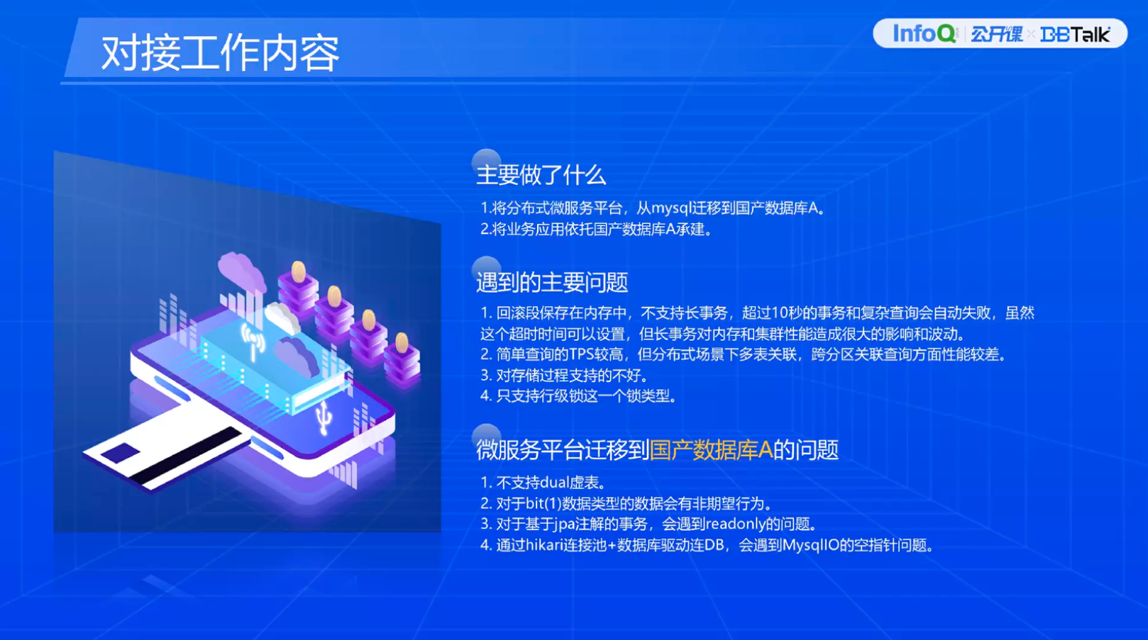 对接过程当中我们也做了很多的工作。首先我们需要将数据库的一些信息,从原本使用的 MySQL 数据库迁移到国产数据库,迁移过程当中就会遇到一些数据库本身的设计方式差异导致的问题。比如说在整个过程中的超时时间,要求我们对超时时间的控制,上层不再要求做 30s、10s 以上的等待,这是我们在这个过程当中需要与上下游重新约定的问题。同时在性能这一侧,我们也发现其实简单的单表查询 TPS 可以达到非常好的效果;但是在多表关联情况下,由于数据需要多节点聚合,这种聚合情况下跨分区或者跨节点的关联查询,性能并不是特别好,不能达到预期。在这种情况下我们需要做一定的区分,在整个生产交易库上更多使用简单查询,在聚合查询侧需要将它剥离再聚合库、数仓做查询。这里进一步要求应用侧能够做好数据流推送与数据订阅推送服务,确保查询交易数据能够更加准确。同时我们也发现了国产数据库对存储过程的支撑情况并不是特别好。所以在必要的时候,我们需要放弃一些数据库的特性,将这些特性上移,放到应用层,以期达到同样的处理效果。当然我们也期望数据库本身在底层实现支撑,能够达到对不同的 SQL 语法以及过程的支撑。