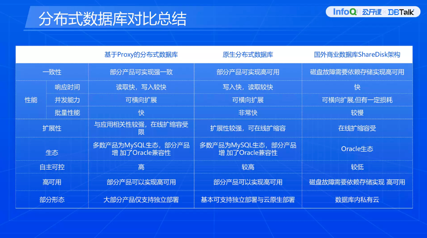 以上是我们对比分布式数据库时主要关注的要点。国产数据库大部分的能力都做的差不多,比较通用、比较完整。但我们也发现有些地方还是需要一些提升的。比如说国家推行个人用户数据的信息安全机制,怎么能够在数据库这一侧得到保障?我们期望数据库这一侧能够提供更好的解决方案,因为从应用侧做这个事情性能并不是特别高。我们不希望像以前那样的粗糙方案,是希望基于特定的字段进行脱密加密,这是我们的诉求。