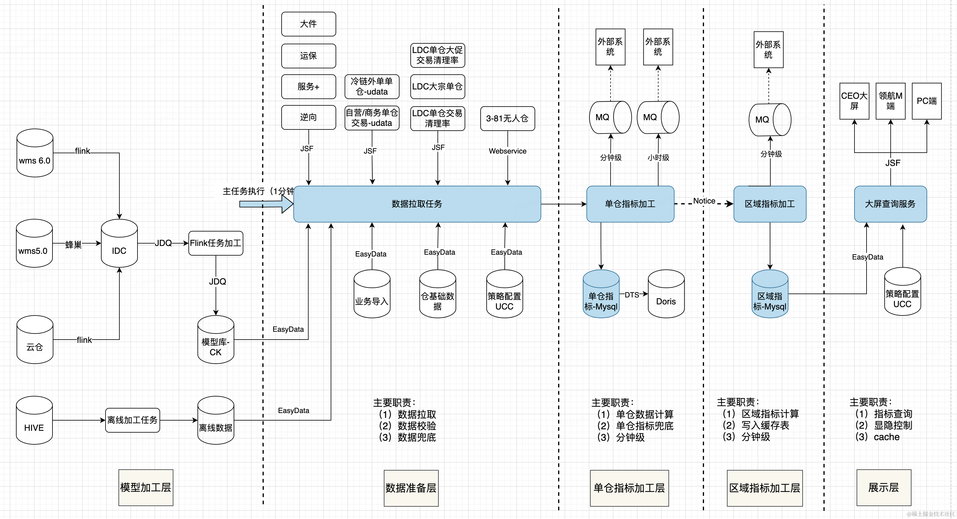 由于数据来源多、复杂度高,为了提升指标服务的稳定性,降低代码复杂度提升可维护性,提升指标的复用性,整体架构分5层,包括模型加工层、数据处理层、单仓指标加工层、区域指标加工层和展示层。各层的职责如上图所示。
