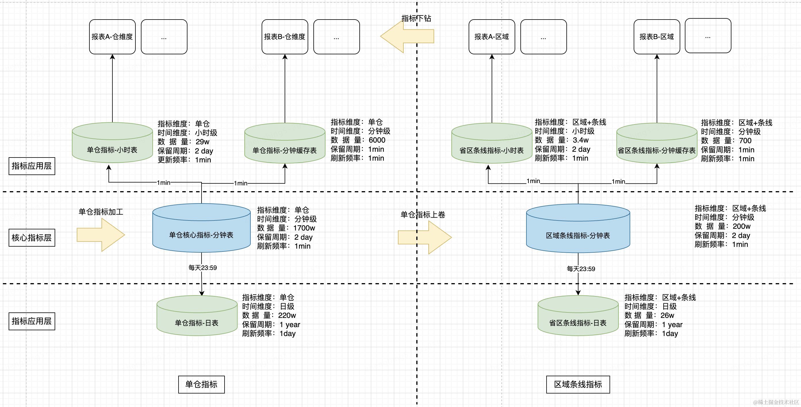 加工和展示分离,可基于单仓原子指标进行区域和品类上卷,既保障了指标的维度一致性(单仓-区域-全国),又保障了同一个数据版本的时间一致性。