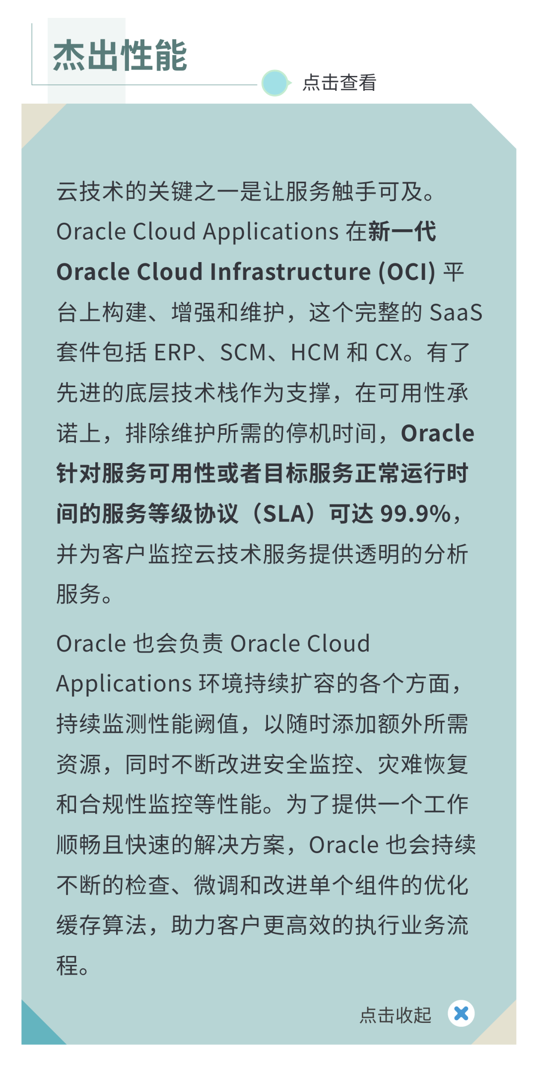 Oracle Cloud Applications 致力在可用性承诺、先进技术、自动化管理以及持续创新等方面为客户提供优质的服务,让客户能顺利上云,并成功实现业务价值。下面我们就来了解 Oracle Cloud Applications 有哪些服务优势。
