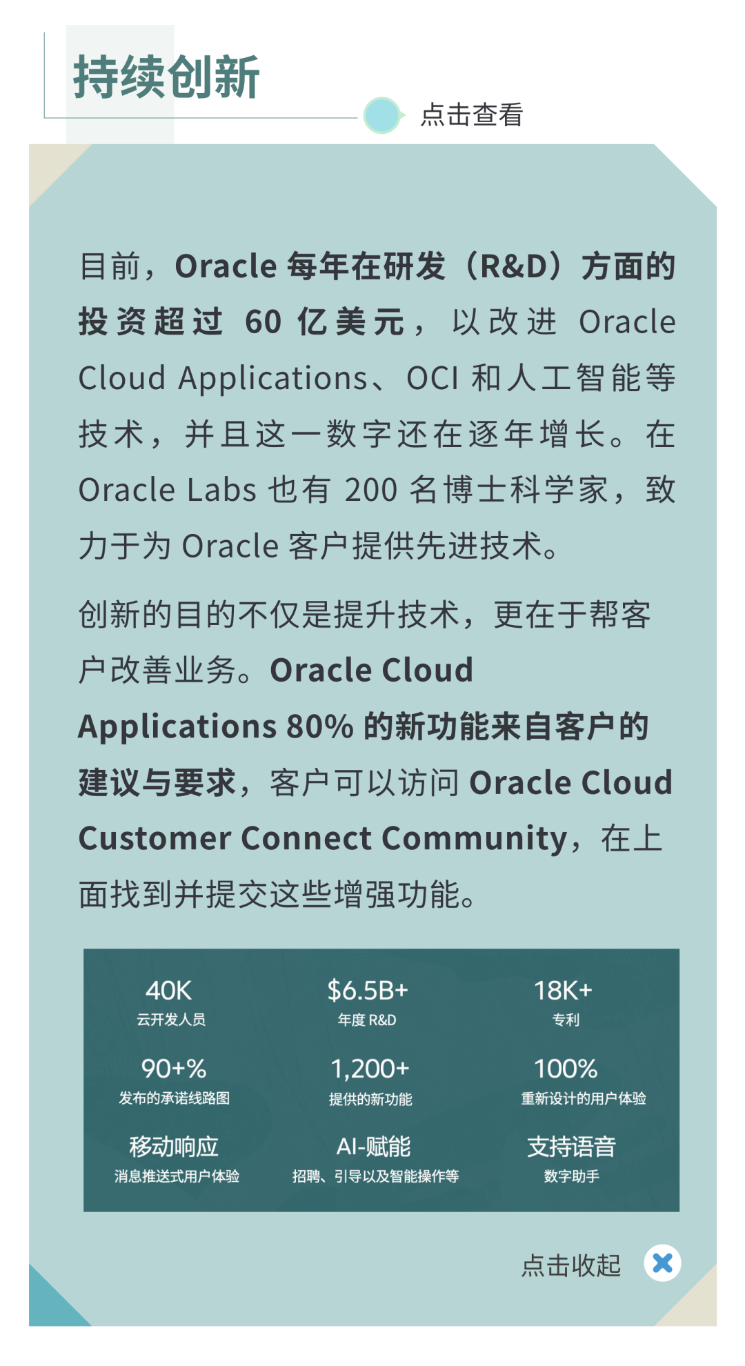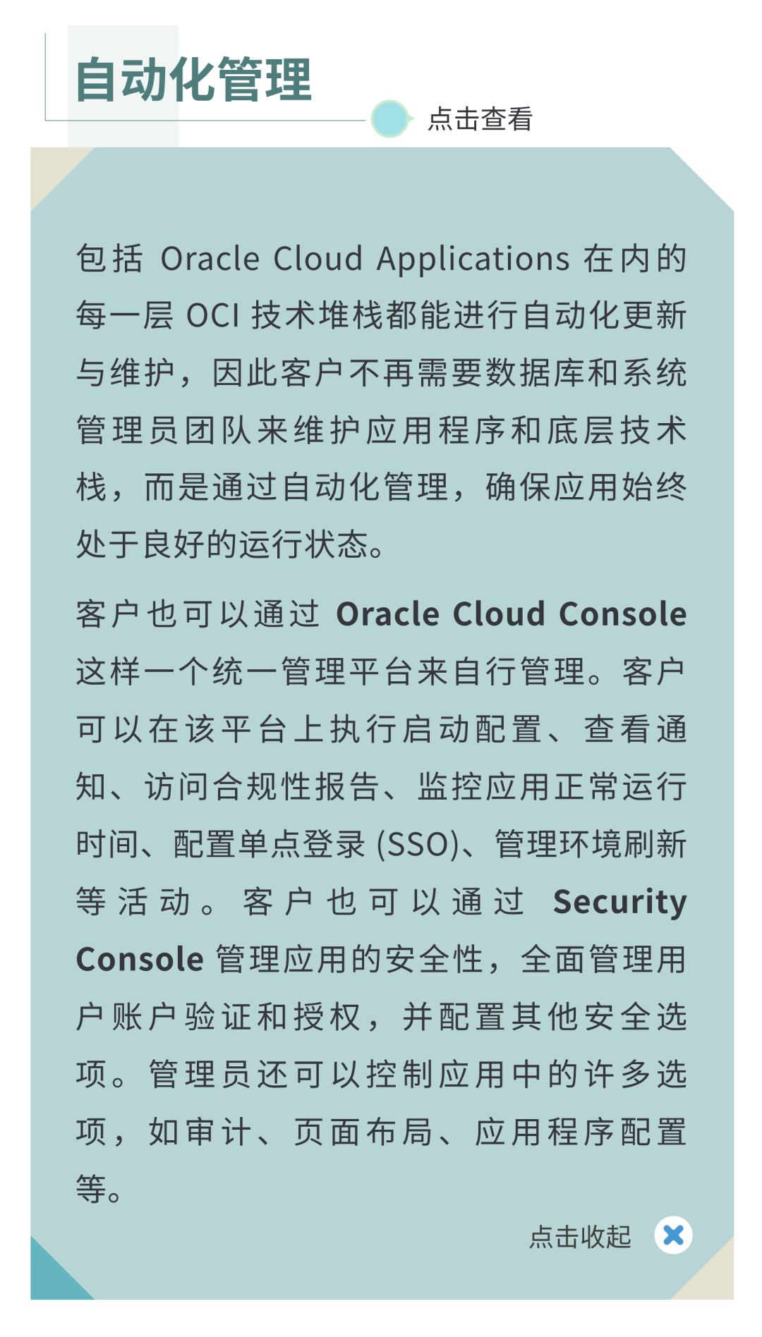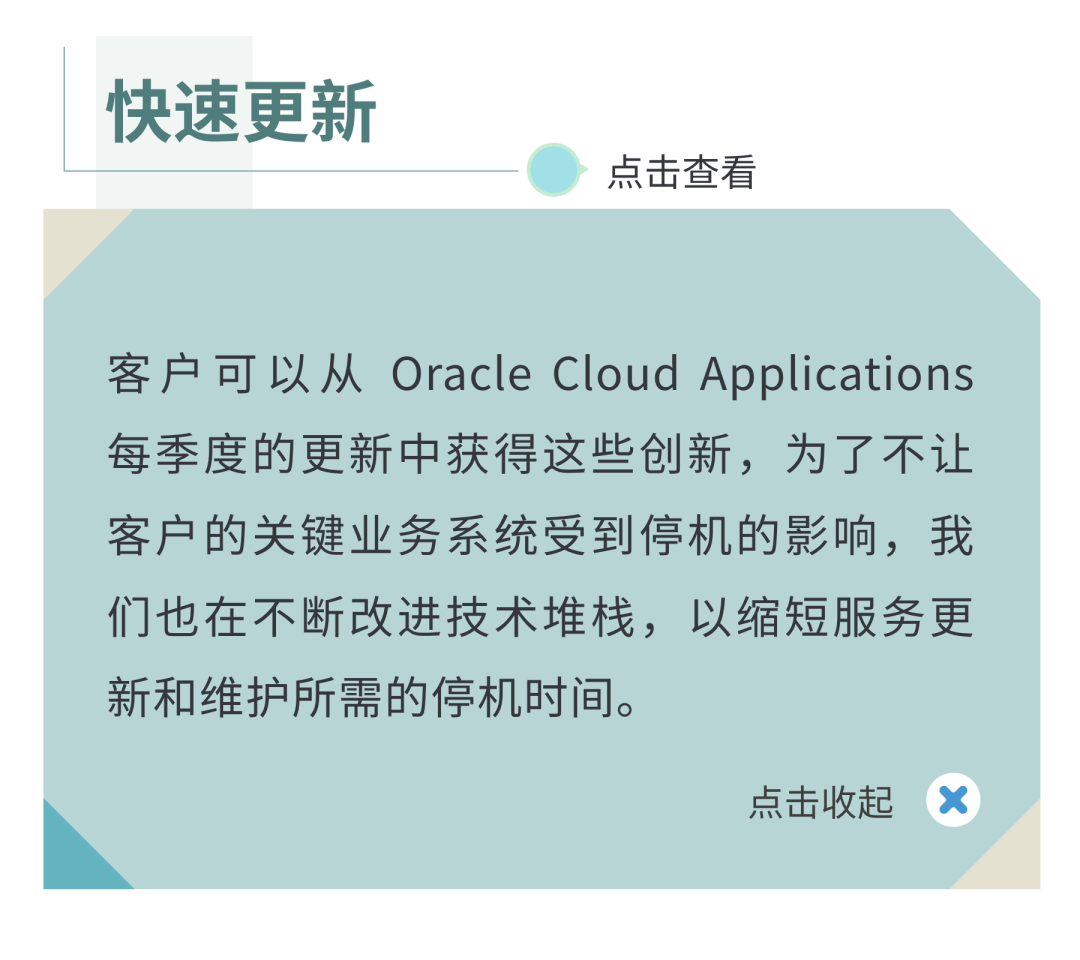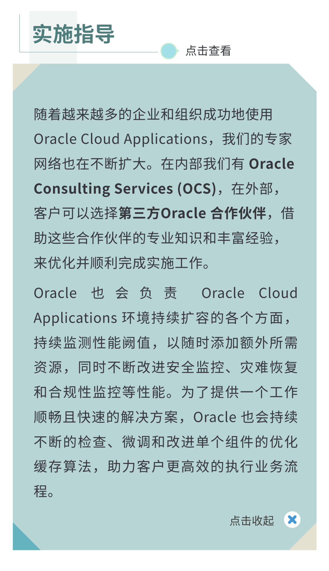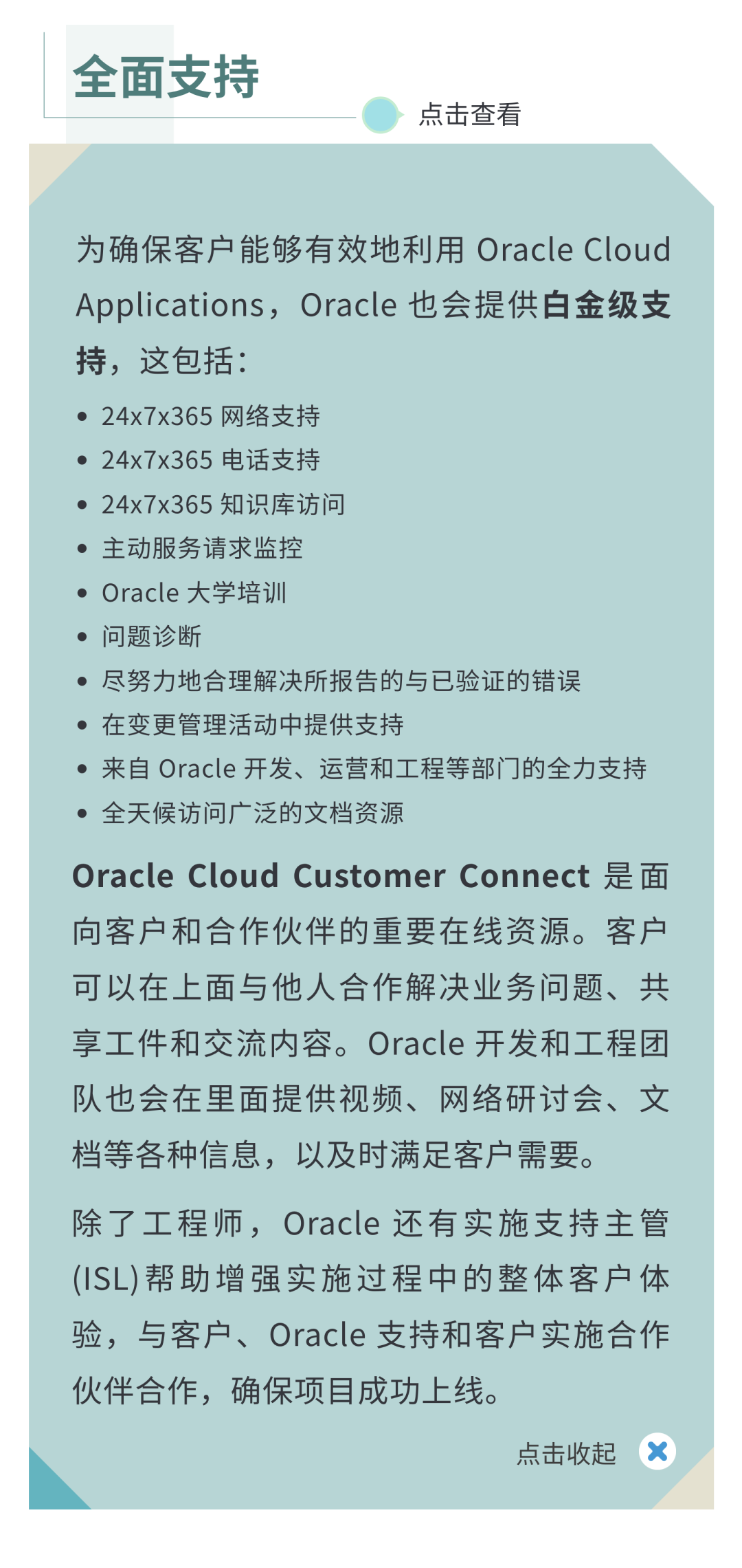 以上简要介绍了 Oracle Cloud Applications 所提供的一些服务。在企业的上云之旅中,我们会为客户提供一个全面、易用的解决方案,以杰出的服务助力企业取得成功。