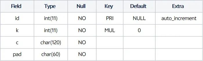 sysbench在MySQL的压测场景产生的一种表结构如下: