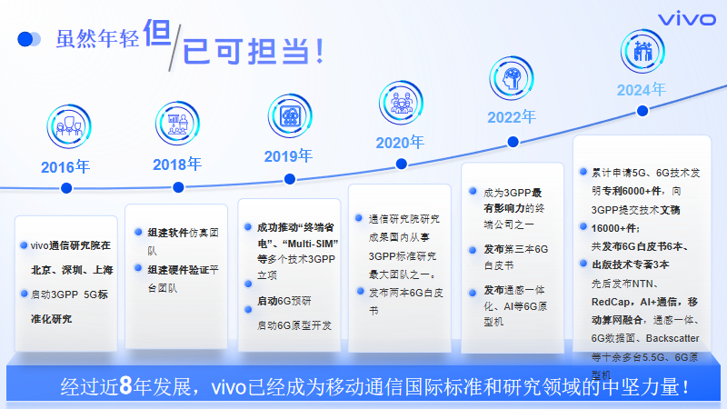 作为 vivo 通信赛道的核心一环,vivo 通信研究院成立于2016年,负责vivo集团移动通信技术的前沿技术研究、国际标准制定和核心技术验证、测试,以及行业标准制定和产业推动工作。虽然组建仅8年,但已累计产出5G、6G技术发明专利6000余件,向国际标准化组织提交技术文稿16000余篇,在3GPP成功推动终端省电、Multi-SIM、LP-WUS、窄带语音卫星通信等多个技术项目,产出NTN、RedCap,AI+通信,6G移动算网融合,6G通感一体、6G数据面、6GBackscatter等十余多台5.5G、6G原型机,发布6G白皮书6本,在人民邮电出版社出版技术专著3本。成为国内移动通信标准化领域,技术能力最强,技术体系最全,国际标准推动力最强的公司之一。