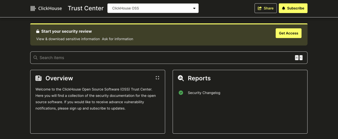 我们非常重视开源社区,并不断改进我们的安全通讯。在2022年,我们推出了 ClickHouse Cloud Trust Center,详细描述了我们的安全控制和合规措施,并允许客户订阅我们计划的更新。