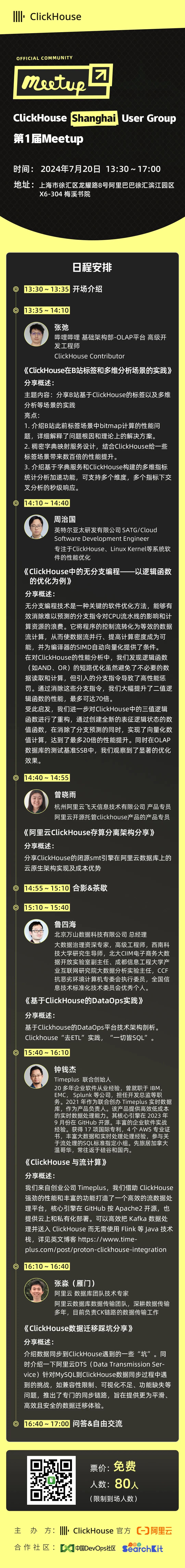 好消息:ClickHouse Shanghai User Group第1届 Meetup 火热报名中,将于2024年7月20日在上海市徐汇区龙耀路8号阿里巴巴徐汇滨江园区X6-304 梅溪书院举行,扫码免费报名