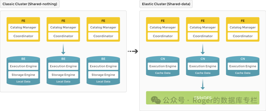 其3.0 版本引入存算分离架构,数据存储功能从原来的 BE 中抽离,BE 节点升级为无状态的 CN 节点。数据可持久存储在远端对象存储或 HDFS 上,CN 本地磁盘只用于缓存热数据来加速查询。存算分离架构下支持动态增删计算节点,实现秒级的扩缩容能力。