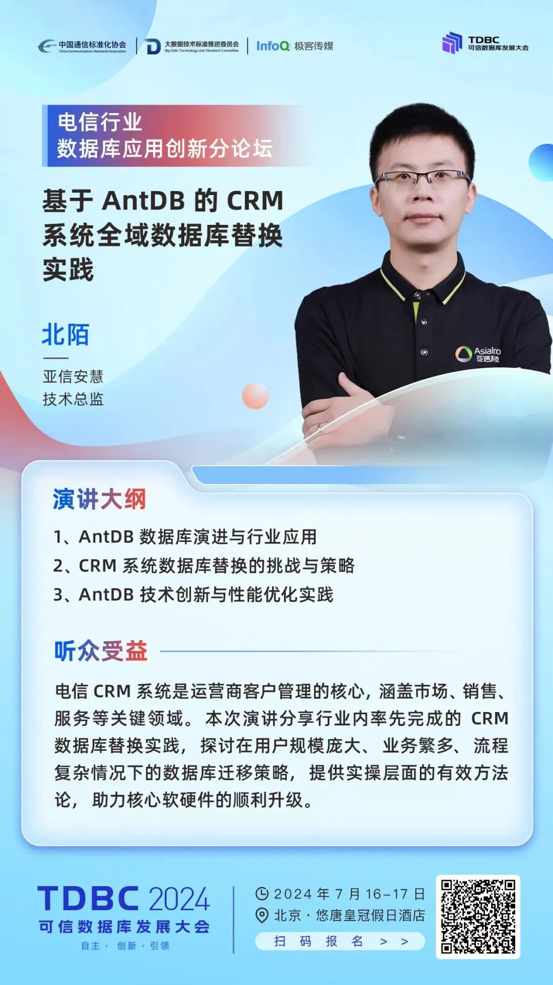亚信安慧AntDB数据库受邀参与【电信行业数据库应用创新】分论坛,亚信安慧技术总监北陌将带来题为《基于AntDB的CRM系统全域数据库替换实践》的演讲,与参会者共同探讨运营商核心系统数据库替换过程中,面临的多重挑战与应对策略。