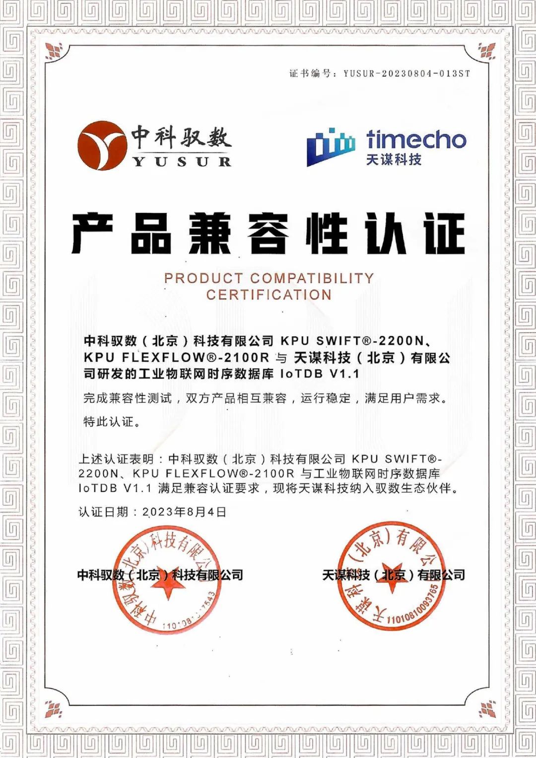 由天谋科技(北京)有限公司(以下简称天谋科技)自主研发的工业物联网时序数据库 IoTDB 顺利通过与中科驭数(北京)科技有限公司(以下简称中科驭数)的 KPU SWIFT®-2200N(低时延网络 DPU 卡)、KPU FLEXFLOW®-2100R(RDMA 网络 DPU 卡)的相互兼容性测试认证,并获得产品兼容性互认证明证书。经过严格的联合测试验证,双方产品相互兼容,运行稳定,满足用户要求,中科驭数也将天谋科技纳入驭数生态伙伴。