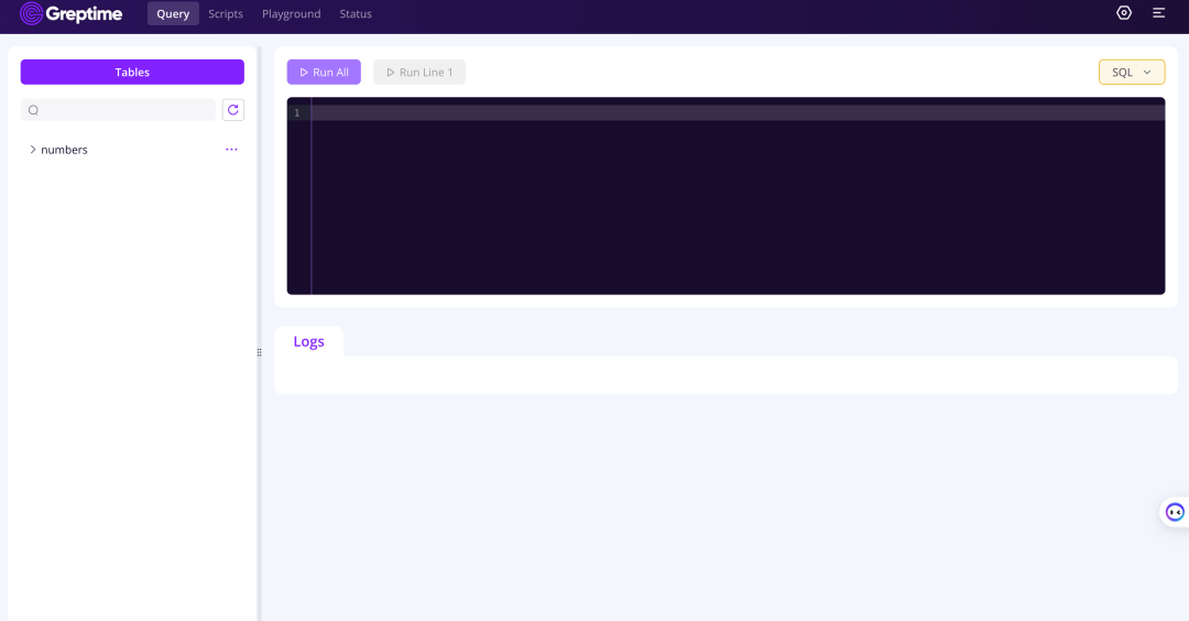 GreptimeDB 支持各类协议端口将正常绑定并监听。我们可以通过浏览器地址 http://localhost:4000/dashboard/ 访问 GreptimeDB 自身携带的 Dashboard,如下所示。