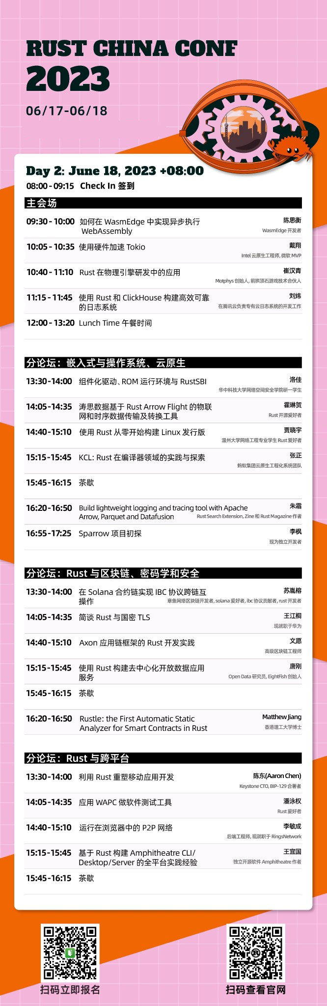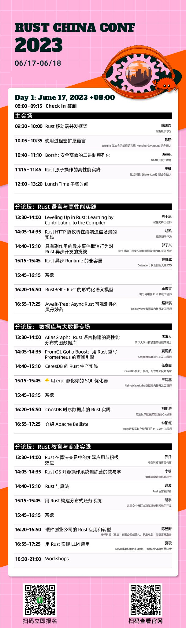 Rust China Conf 2023 将于本周末 6 月 17 日- 18 日在上海东锦江希尔顿逸林酒店举办,诚邀各位 Rust 语言爱好者参与大会,Greptime 核心工程师夏锐航将发表题为《用 Rust 重写 Prometheus 的查询引擎》的主题演讲,共襄 Rust 又一年的革新与进步!