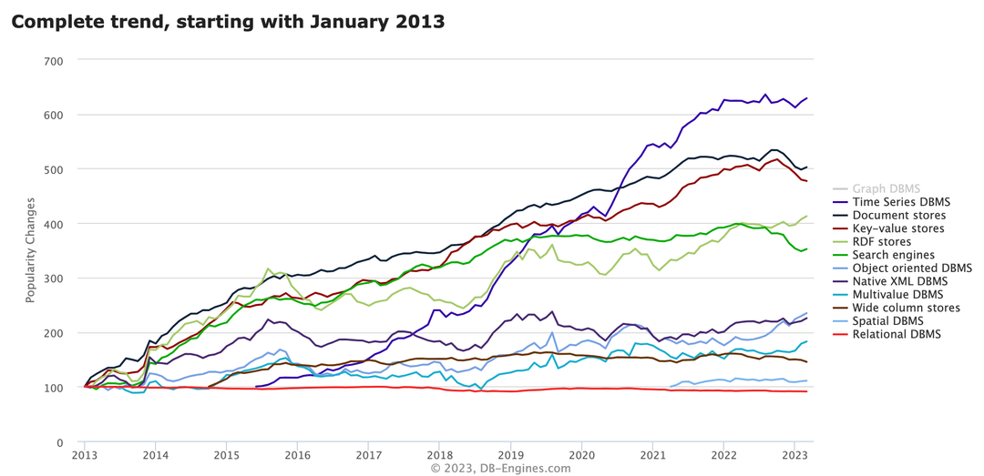 在过去的几年里,物联网(IoT)的日益普及和对实时数据的需求导致时序数据库(TSDB)的采用量大幅增长。根据 DB-Engines 的排名,TSDB 的普及率超过了其他任何类型的数据库,仅次于 Graph DBMS。