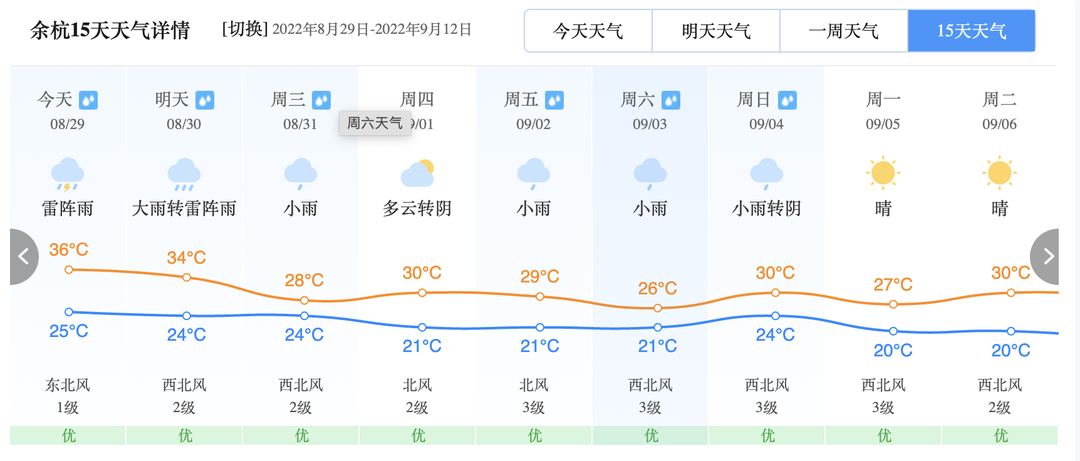 举例来说,比如某天气网站截图的余杭 15 天的天气预报: