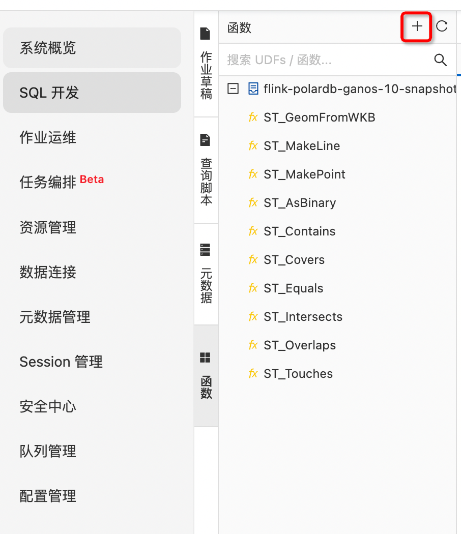 获取jar包后,在Flink工作空间中进行上传操作(如图中+号位置),Flink会自动注册相关的函数,并展示在左侧的函数列表中。